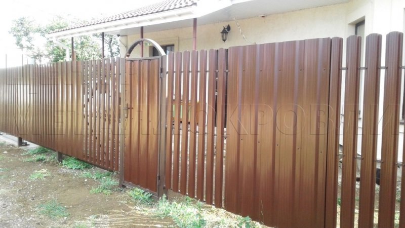 • Профилированный лист (профнастил) — традиционный вариант сплошного ограждения: создаёт звукоизоляцию, скрывает происходящее на участке от посторонних взглядов, легко монтируется.