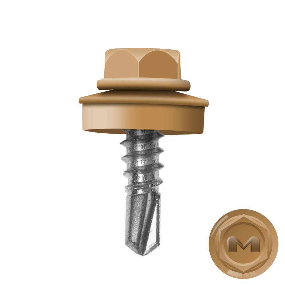 Кровельные саморезы Daxmer (Даксмер) по металлу цветом RAL1011 Светлое дерево 5,5*19мм имеют частую резьбу, а специальная металлическая шайба с ЕРDМ-уплотнителем 2,8 мм обеспечивает плотное прилегание профилированного металла (кровли) к обрешетке, а также препятствует попаданию влаги. Также ЕРDМ-уплотнитель защищает от перепада температур (за счет высокого содержания каучука), который адаптируется под окружающую температуру и не позволяет кровле или забору «гулять», плотно прижимая листы к основанию.