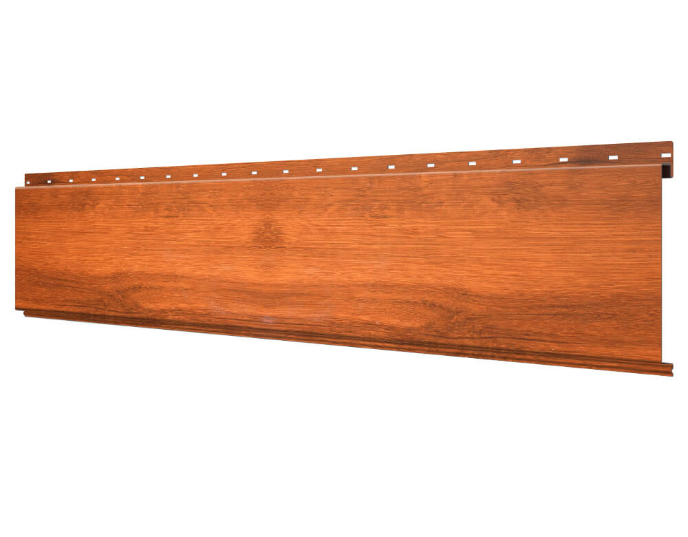 Линеарная потолочно-стеновая панель ГЛАДКАЯ цвет под дерево Кедр Темный 3Д SteelArt Россия применяется в качестве софитов для подшивы крыши, наружной и внутренней отделки потолков, стен, фронтонов фасада дома в Барнауле.