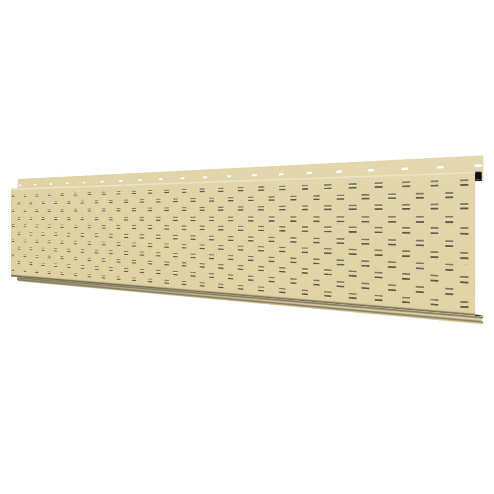 Линеарная потолочно-стеновая панель с ПЕРФОРАЦИЕЙ для вентиляции цвет RAL1014 Бежевый применяется в качестве софитов для подшивы крыши, наружной и внутренней отделки потолков, стен, фронтонов фасада дома в Барнауле.
