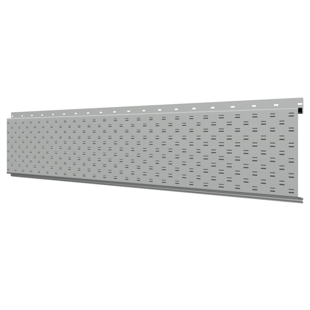 Линеарная потолочно-стеновая панель с ПЕРФОРАЦИЕЙ для вентиляции цвет RAL9006 Серебро применяется в качестве софитов для подшивы крыши, наружной и внутренней отделки потолков, стен, фронтонов фасада дома в Барнауле.