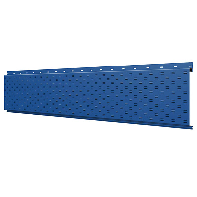 Линеарная потолочно-стеновая панель с ПЕРФОРАЦИЕЙ для вентиляции цвет RAL5005 Синий Сигнал применяется в качестве софитов для подшивы крыши, наружной и внутренней отделки потолков, стен, фронтонов фасада дома в Барнауле.
