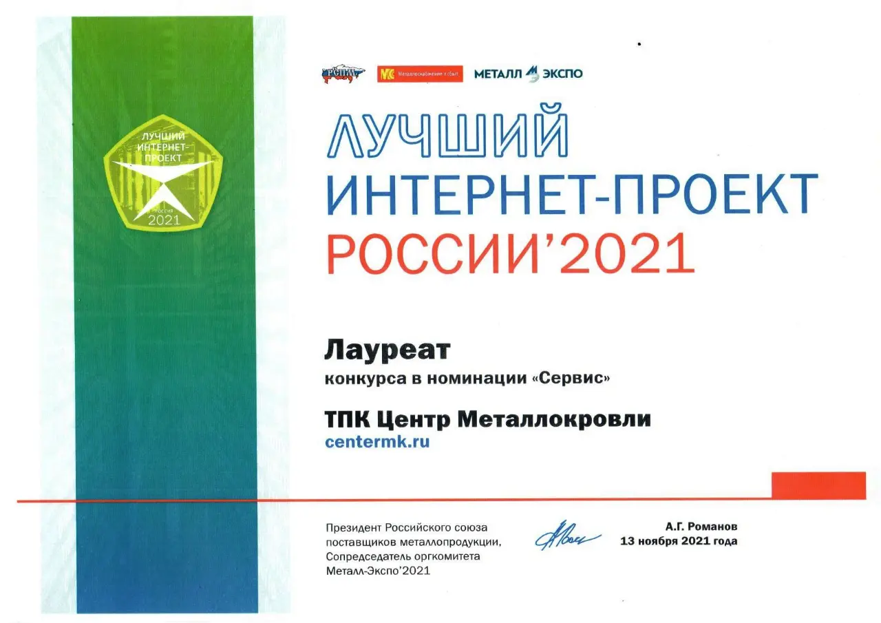 Диплом лауреата конкурса "Лучший интернет-проект России 2021" в номинации "Сервис"