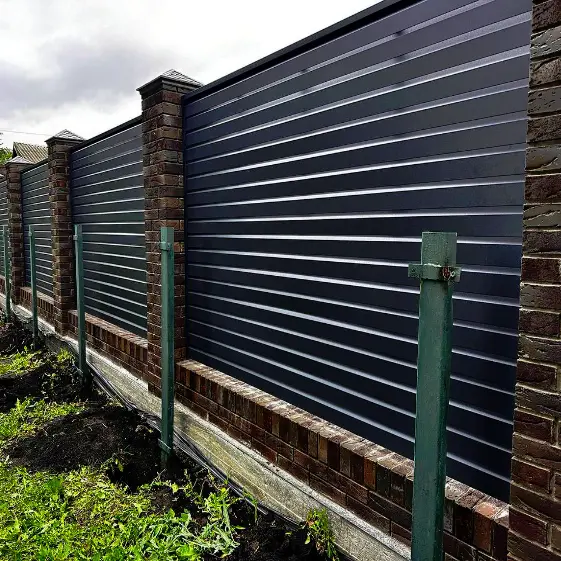 Забор-жалюзи Хай-Тек в цвете RAL 7024 MATTE Серый Графит с двусторонним матовым покрытием имеет стильный и лаконичный вид, гармонично сочетающийся с любым архитектурным решением. Эффектные кирпичные столбы подчеркивают строгую геометрию и добавляют надежности всей ограждающей системе. Такой забор не только обеспечивает приватность и защиту территории, но и становится выразительным элементом экстерьера, подчеркивающим индивидуальность участка.