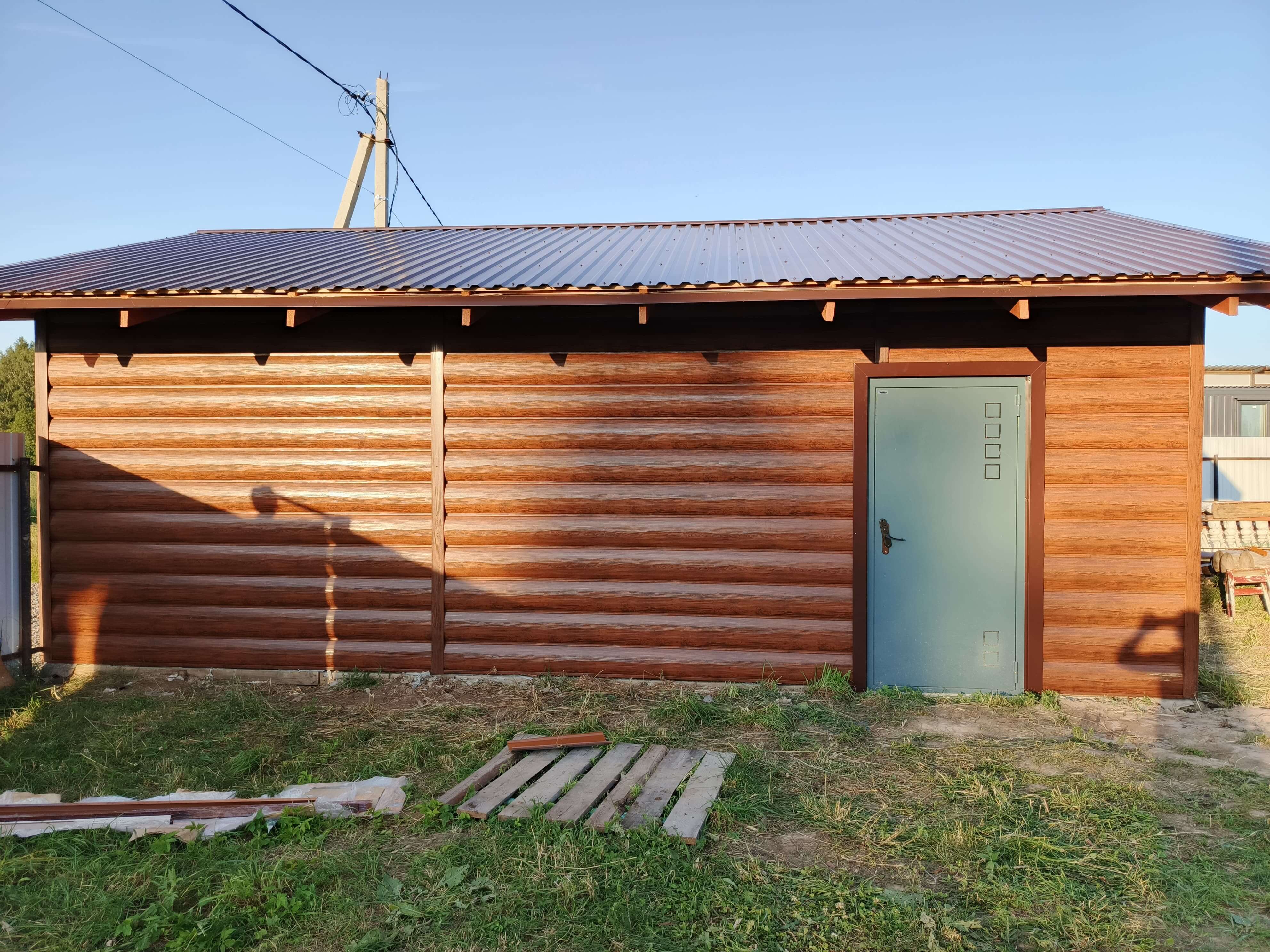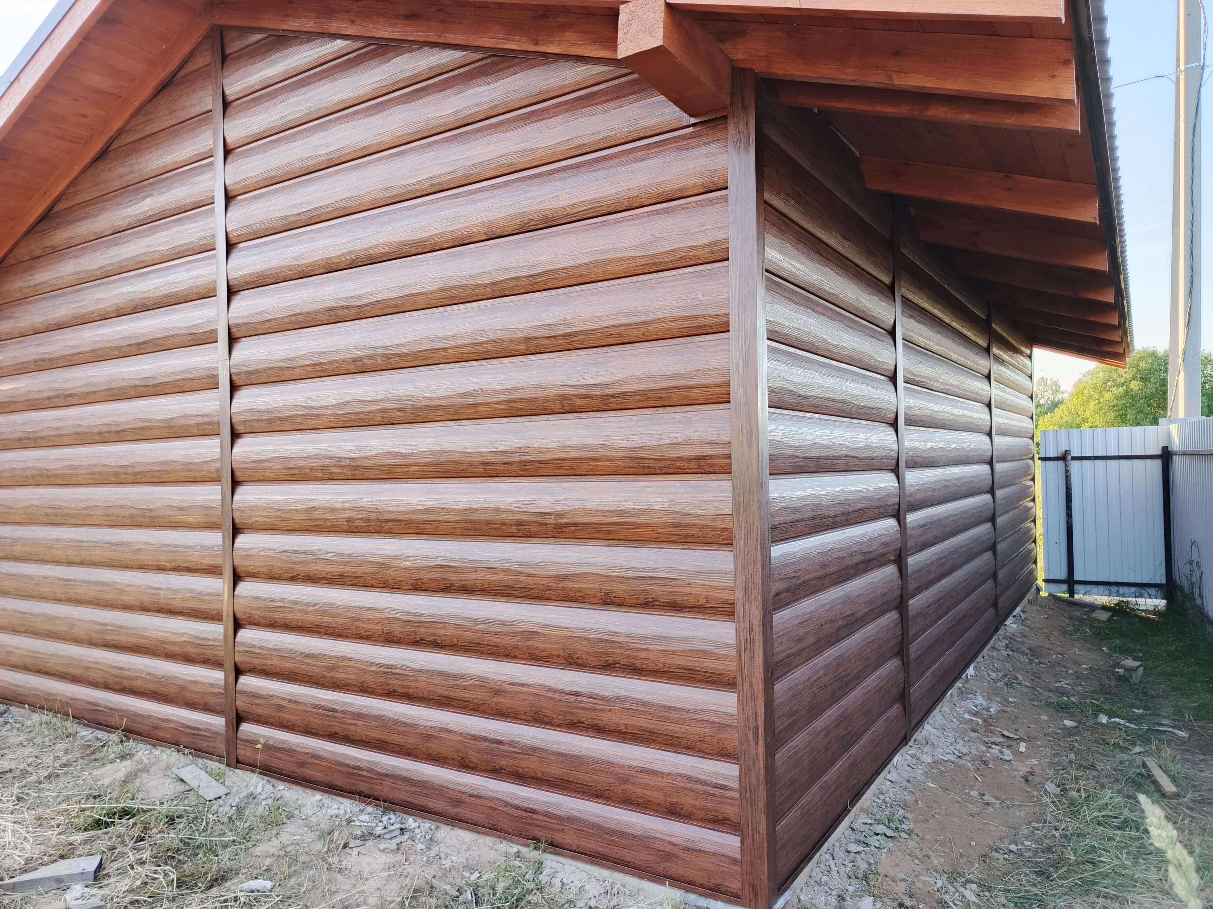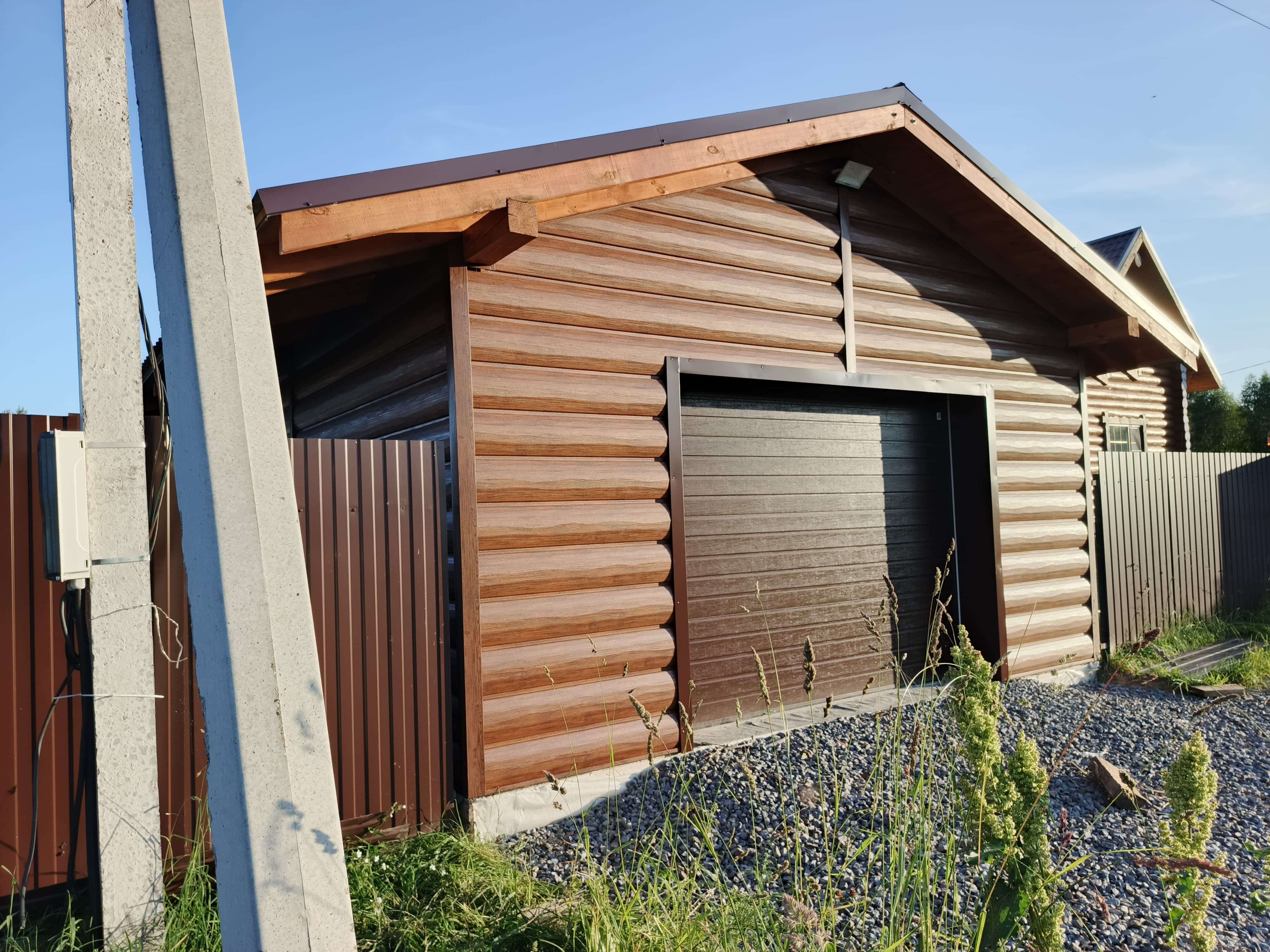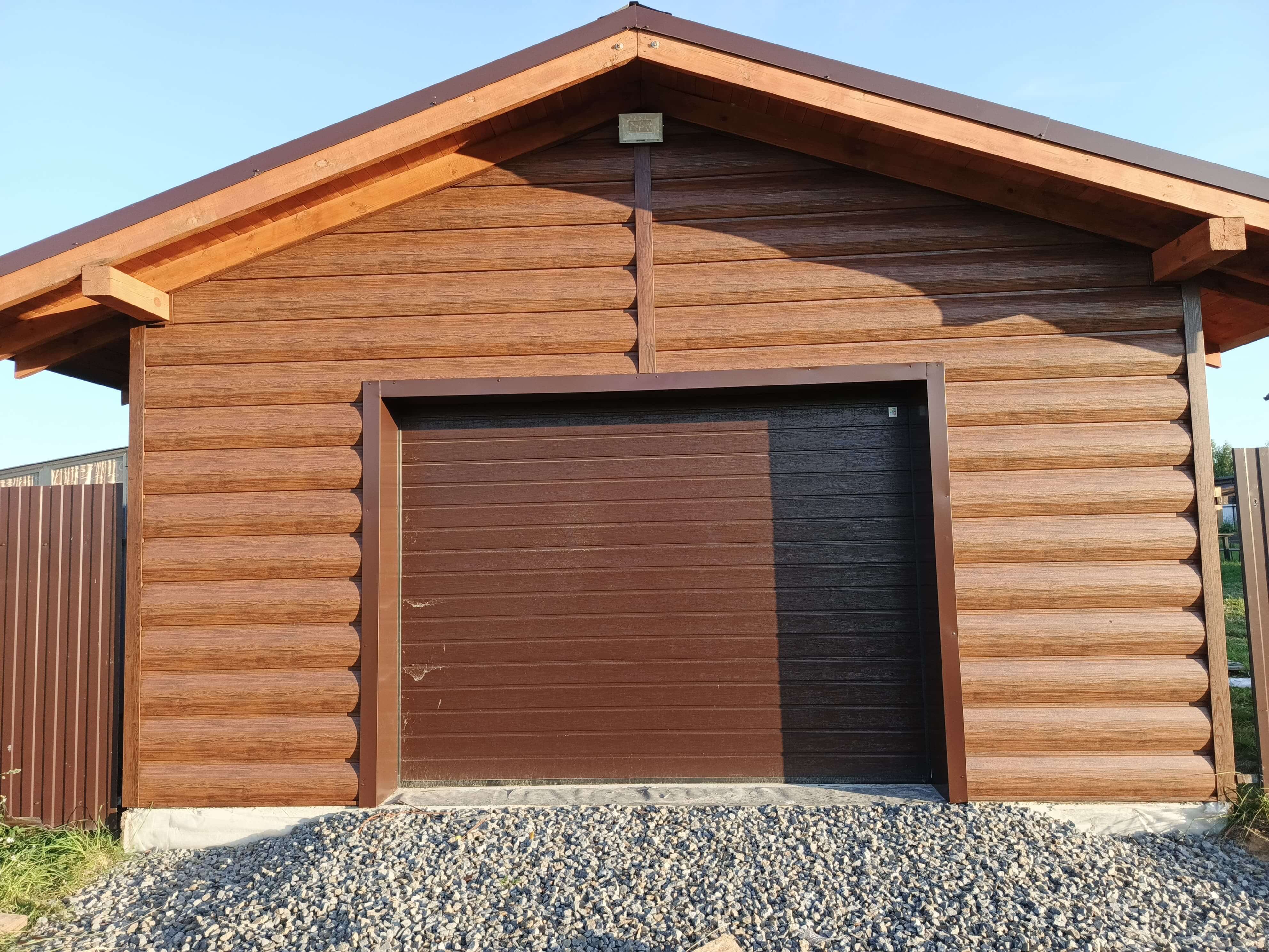 Отделка фасада гаража металлическим сайдингом под рубленое бревно (имитация деревянного сруба)