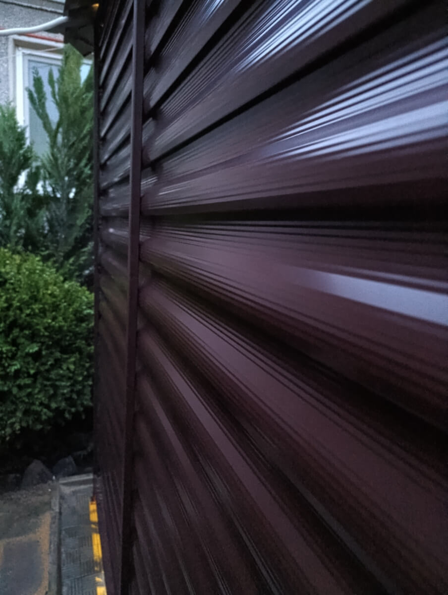 Ламель Еврожалюзи Printech под дерево Каштан для заборов-жалюзи, беседок, пергол Секция забора жалюзи из ламелей еврожалюзи под дерево Каштан с кирпичными столбами анфас Секция забора жалюзи из ламелей еврожалюзи под дерево Каштан с кирпичными столбами Секция забора жалюзи из ламелей еврожалюзи под дерево Каштан с металлическими столбами анфас Секция забора жалюзи из ламелей еврожалюзи под дерево Каштан с металлическими столбами