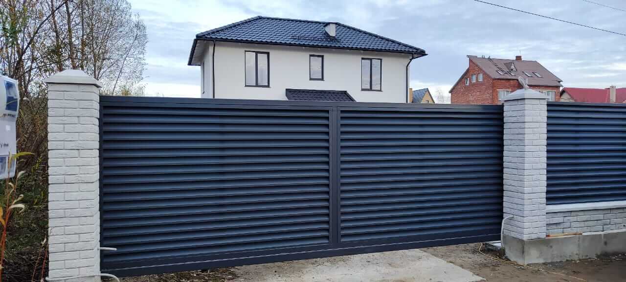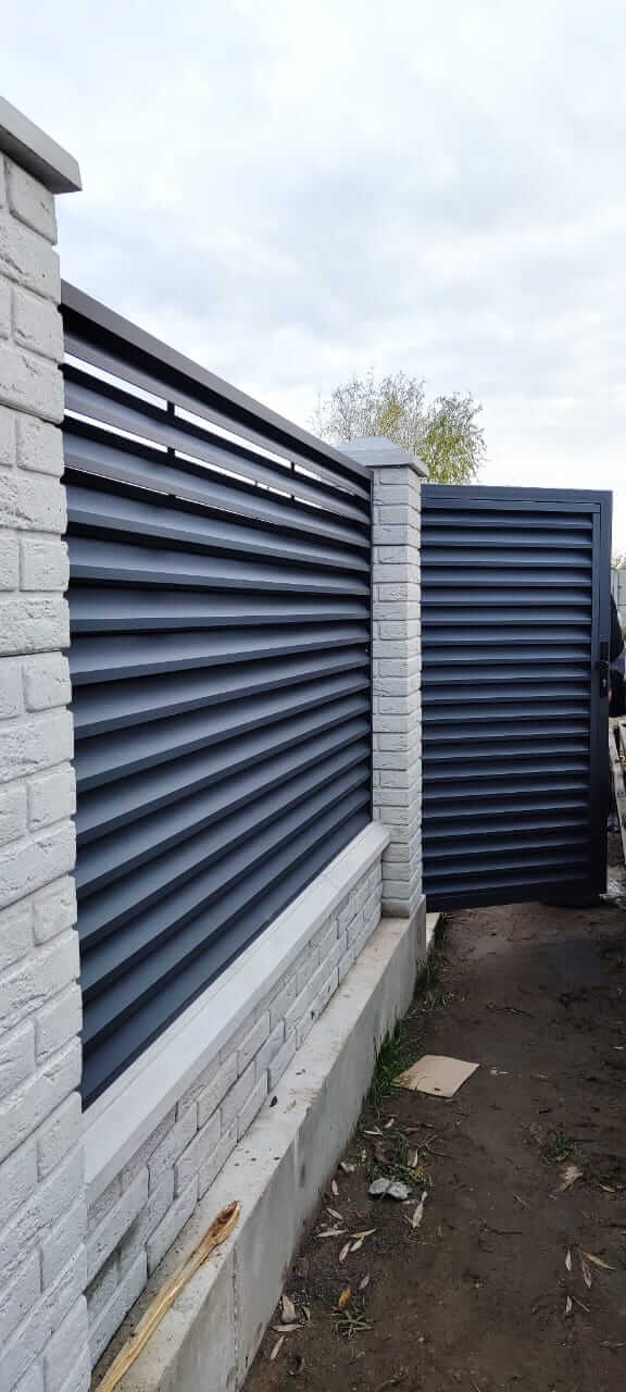 Забор жалюзи ЭКО-Z RAL 7024 МАТТЕ Серый Графит матовый односторонний с кирпичными столбами Забор жалюзи ЭКО-Z RAL 7024 МАТТЕ Серый Графит матовый односторонний на кирпичных столбах Забор жалюзи ЭКО-Z RAL 7024 МАТТЕ Серый Графит матовый односторонний с металлическими столбами Забор жалюзи ЭКО-Z RAL 7024 МАТТЕ Серый Графит матовый односторонний на металлических столбах