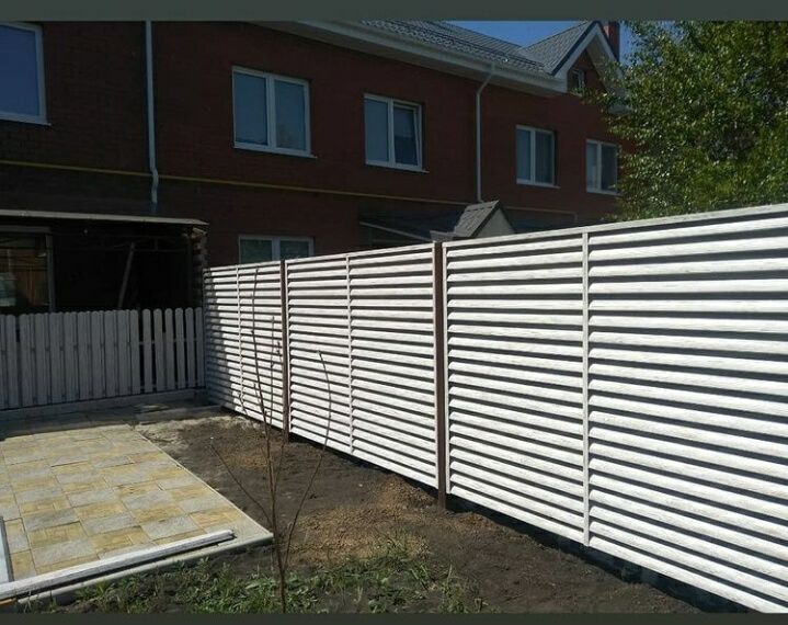 Забор-жалюзи с ламелями Еврожалюзи от ТПК Центр Металлокровли цвет Белёный Дуб ⠀ ✅ Забор установлен в городе: Тюмень ✅ Вид секции: забор-жалюзи ✅ Столбы: металлическая профильная труба ✅ Профиль металлических ламелей: Еврожалюзи ✅ Цвет и покрытие ламелей: цвет Белёный Дуб